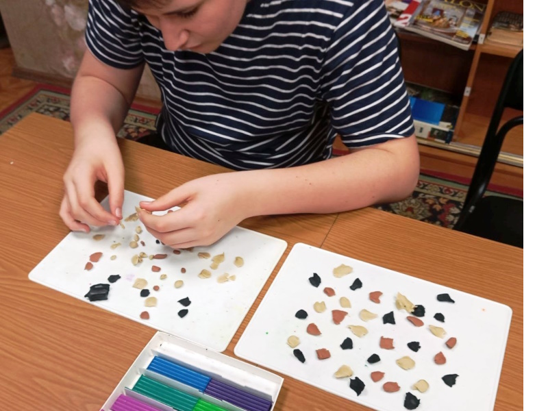 В учреждении проведено занятие по лепке с ребёнком с ограниченными возможностями здоровья. Инструктор по труду показала как можно лепить из целого куска пластилина (без отрыва) животных, раскатав нужную форму, постепенно вытягивая из него тело, голову, ушки, лапки, хвост. Такой необычный способ помогает развить пластичность пальцев, улучшить когнитивные способности ребенка.